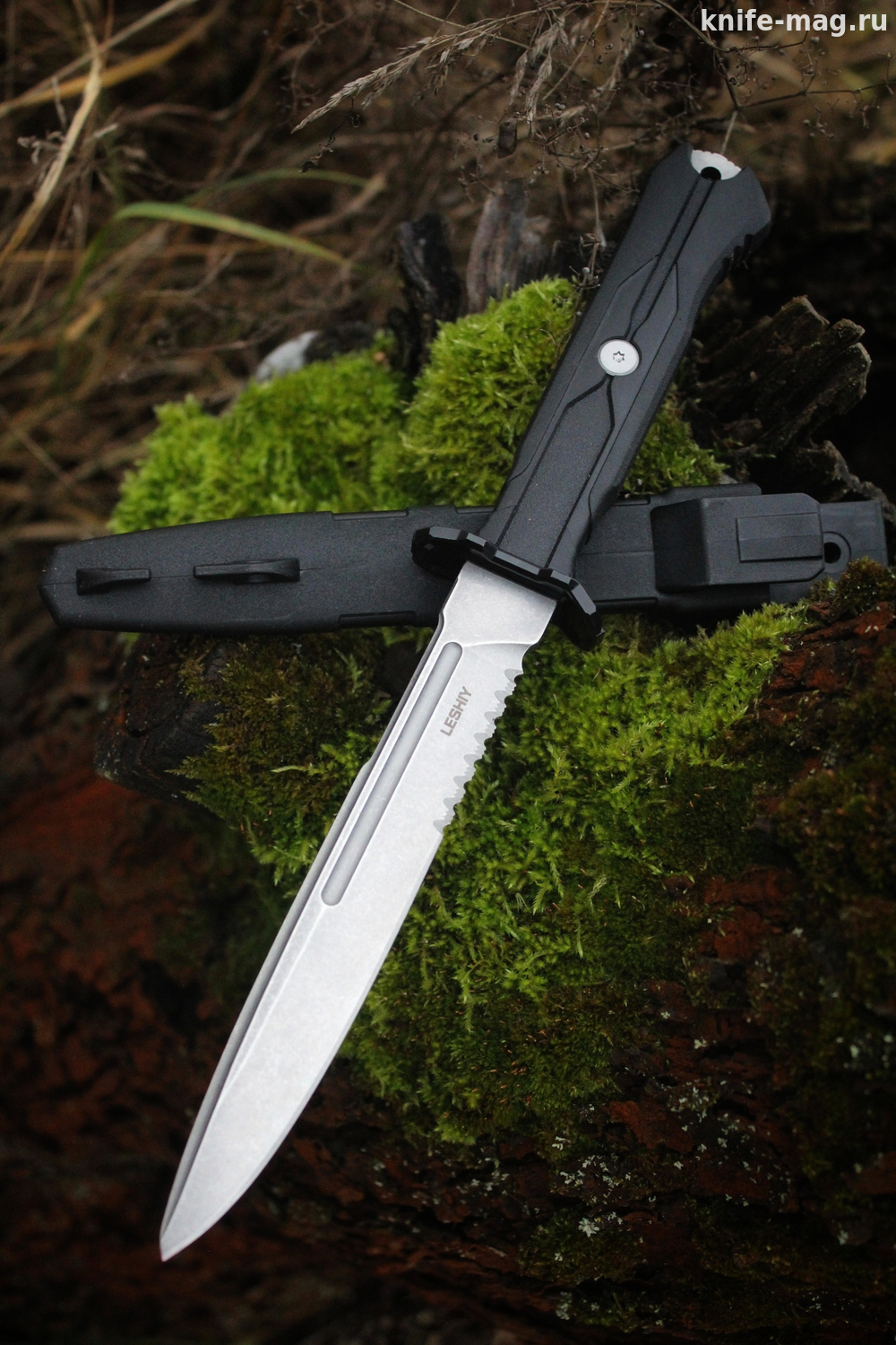 Рукоять «Лешего» отлита из эластрона, который зарекомендовал себя как прочный и надежный материал для военных и полевых ножей, полноценный широкий хвостовик проходит ее насквозь, выходя со стороны тыльника и образуя стеклобой. Широкая гарда обеспечивает надежное удержание при ударе в твердую преграду, даже в случае когда ладони пользователя влажные или липкие.