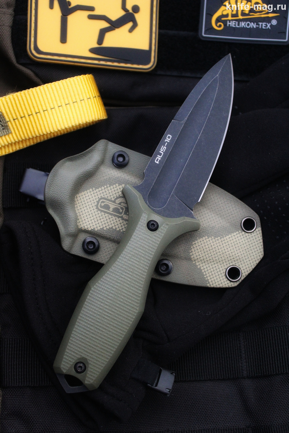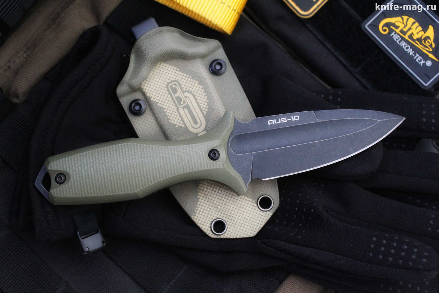 Рукоять выполнена из стеклотекстолита G10 — это композитный материал на основе стеклоткани и эпоксидной смолы. В процессе производства стекловолокно вымачивается в смолах, после чего подвергается сжатию. В результате получается материал, отлично показывающий себя при работе в неблагоприятных условиях. G10 прочен и ударостоек, отлично переносит влагу и хорошо поддаётся окраске. Внешне очень похож на микарту, но превосходит её в прочности и огнестойкости.